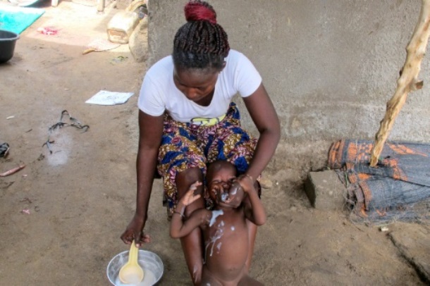 Asise sur un tabouret, Florence Gavaina pose à côté d’elle une assiette contenant de la bouillie de maïs. Elle déshabille alors sa petite fille, l’asperge d’un peu d’eau et la fait asseoir sur ses pieds, dos contre ses jambes et tête coincée entre ses genoux.