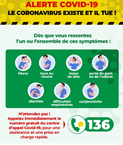 « Dès que vous ressentez la fièvre, la toux, le rhume, les maux de tête, la perte du goût ou de l’odorat, la diarrhée, les difficultés respiratoires, la conjonctivite…. n’attendez plus un seul instant! Alertez le centre d’appel covid-19 au Bénin en appelant le numéro gratuit 136 », souligne le gouvernement.