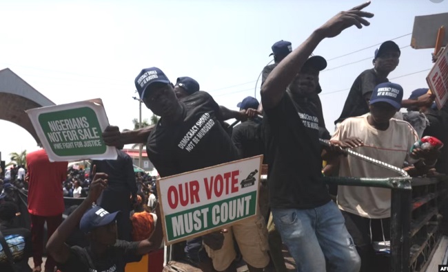 Des centaines de militants du PDP, habillés en noir, ont marché lundi midi jusqu’au siège de la Commission électorale, en agitant des pancartes sur lesquelles on pouvait lire « Non au trucage des élections », « Inec, publiez les vrais résultats » ou encore « Sauvons notre démocratie ».