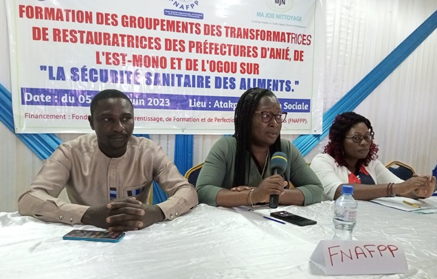 Cette formation est initiée par l’ONG ODOUGBO, avec l’appui financier du Fonds National d’Apprentissage, de Formation et de Perfectionnement Professionnels (FNAFPP) dans le cadre de la mise en œuvre du projet « de formation des groupements de transformateurs, de restaurateurs des préfectures de l’Anié, de l’Est-mono et d’Ogou sur la sécurité sanitaire des aliments » pour la promotion de l’hygiène alimentaire. La formation est assurée par le cabinet Ma Joie Nettoyage (MJN).