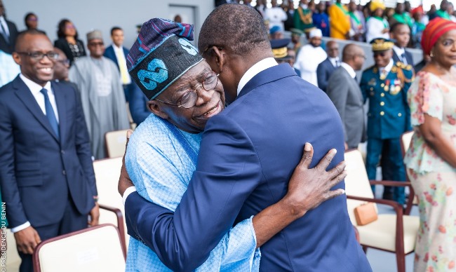 Bola Tinubu, président nigérian et président en exercice de la Communauté économique des Etats de l’Afrique de l’ouest (Cédéao) a passé quelques heures mardi à Cotonou où il a assisté au défilé marquant le 63è anniversaire de l’indépendance du Bénin, un « nouveau signal à la communauté bénino-nigériane », a salué Patrice Talon.