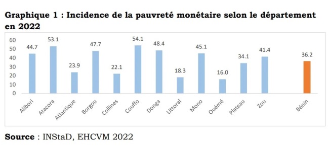 Les départements de l’Ouémé et du Littoral présentent les plus faibles incidences de pauvreté monétaire avec respectivement 16,0 % et 18,3 % tandis que l’Atacora (53,1 %) et le Couffo (54,1 %) sont les départements ressortant avec les niveaux les plus élevés d’incidence de pauvreté monétaire.