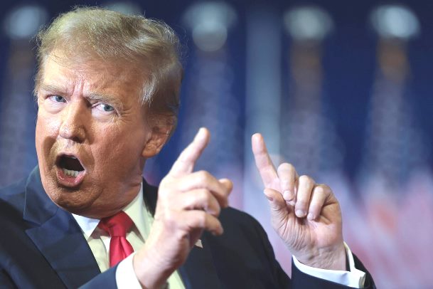 Arborant sa traditionnelle cravate rouge, il a évoqué pèle-mêle son procès au civil pour agression sexuelle et sa condamnation au pénal: des « chasses aux sorcières » pour l’empêcher d’être élu, selon lui.