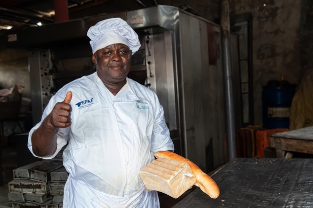 À la baguette, devant son four, Pierre Gbenou Tito Dossou, le jovial propriétaire de la boulangerie, est aujourd’hui un homme heureux.