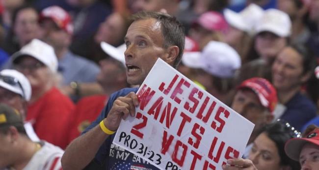 Inès me montre ses cartes, où Jésus pose sa main protectrice sur l’épaule de Trump. Elle s’est converti au judaïsme de son mari, mais tracte pour Trump à la sortie des églises.