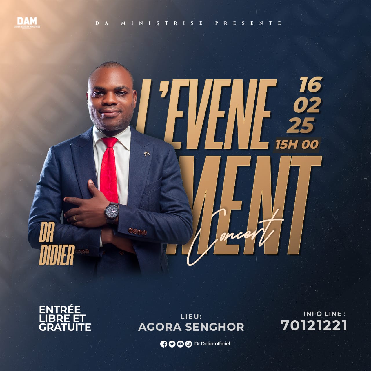 Lomé, le 18 janvier 2025 – Le Staff de DA Ministries est fier de dévoiler le tout premier concert gospel live de l’homme de Dieu et artiste gospel togolais, Dr Didier, qui se tiendra le 16 février 2025 à l’Agora Senghor de Lomé. Cet événement exceptionnel marquera une étape importante dans la carrière de cet artiste engagé, et promet une expérience musicale unique pour les amateurs de gospel et de louange.