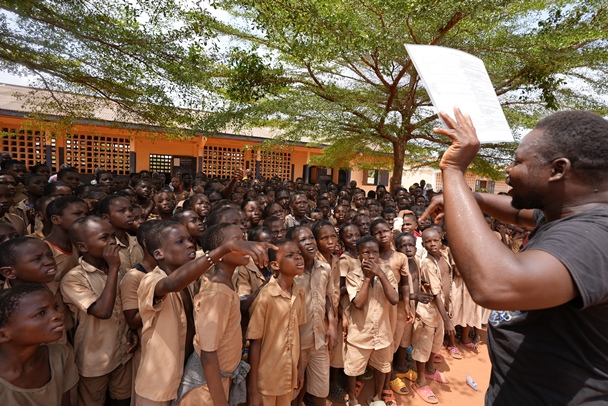 Face à la foule d’élèves, M. Noumédzro fait défiler des cartons montrant des dessins que commentent les enfants, sous le regard attentif des enseignants et parents d’élèves.