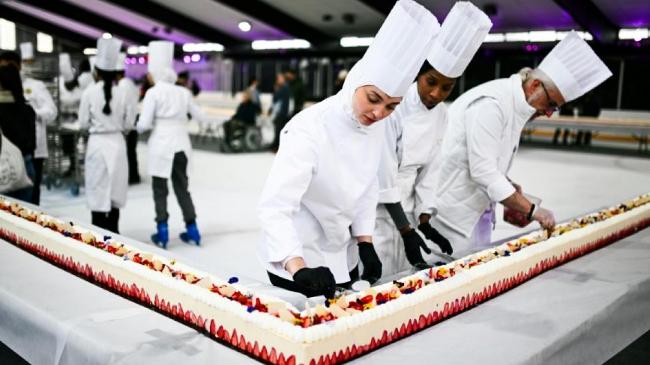 Ayant mobilisé une vingtaine de pâtissiers de différentes maisons et origines, l’élaboration du fraisier de 1,2 tonne a nécessité près d’une semaine de travail, avec la préparation de la mousseline et du biscuit en laboratoire. Le montage sur la patinoire a ensuite pris toute une nuit et une bonne partie de la journée.