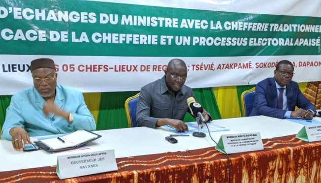 Les togolais iront aux urnes les 17 juillet 2025 pour les élections municipales. Cette rencontre s’inscrit dans le cadre du projet : « Tournée d’échanges du ministre de l’administration territoriale, de la décentralisation et de la chefferie coutumière et les conseils des chefs traditionnels dans les cinq régions du Togo ».