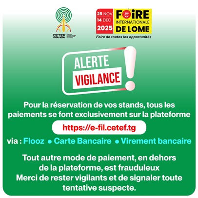 « Pour la réservation de vos stands, tous les paiements se font exclusivement sur la plateforme https://e-fil.cetef.tg via Flooz, carte bancaire, virement bancaire. Tout autre mode de paiement, en dehors de la plateforme, est frauduleux », précise le Centre qui exhorte à la vigilance et à signaler toute tentative suspecte.