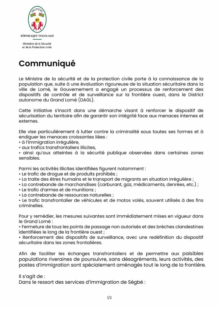 Le gouvernement togolais a mis en place, des « dispositifs de contrôle et de surveillance » sur la frontière ouest de Lomé, suite à une « évaluation de la situation sécuritaire » dans la ville, indique un communiqué du ministre de la sécurité publié mardi soir.