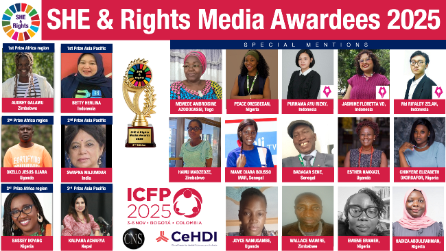 Organisés par Citizen News (CNS) et le Centre mondial pour la diplomatie et l’inclusion en matière de santé (CeHDI), en collaboration avec l’ICFP et plusieurs autres organisations partenaires, les SHE & Rights Media Awards 2025 ont mobilisé cette année, 369 candidatures provenant de 32 pays du monde.