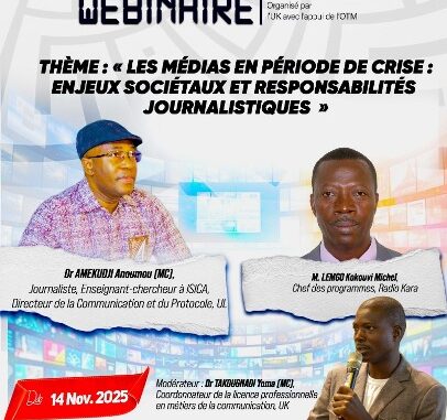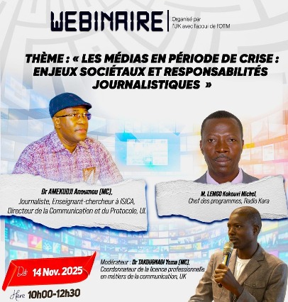 L’Université de Kara, a organisé ce vendredi 14 novembre 2025, avec l’appui de l’Observatoire Togolais des Médias (OTM), un webinaire axé sur le thème : « Les médias en période de crise : Enjeux sociétaux et responsabilités journalistiques ».