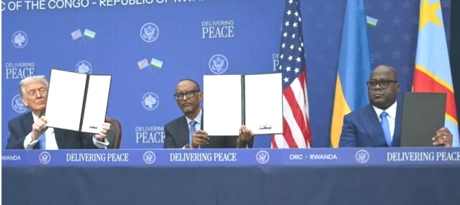 Le président Donald Trump a présidé jeudi à Washington (Etats-Unis) une cérémonie de signature d’un accord de paix avec ses homologues congolais et rwandais, dans un bâtiment renommé en son honneur, parlant d’un « miracle » alors même que d’intenses combats se déroulent dans l’est de la République du Congo.