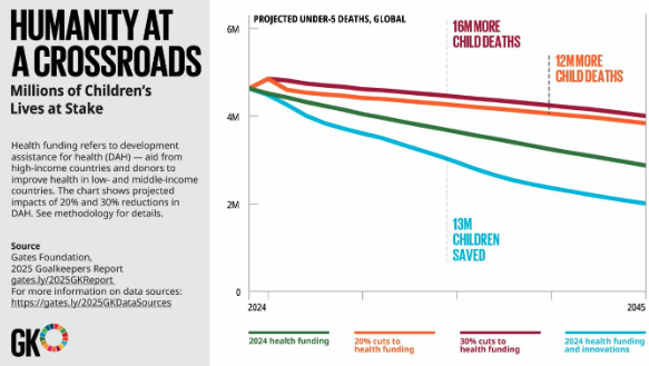 Selon le rapport Goalkeepers 2025, 4,6 millions d’enfants sont décédés en 2024 avant leur cinquième anniversaire. En 2025, ce chiffre devrait augmenter pour la première fois depuis le début du siècle, de plus de 200 000, pour atteindre environ 4,8 millions d’enfants. Cela équivaut à plus de 5 000 salles de classe d’enfants disparus avant même d’apprendre à écrire leur nom ou à lacer leurs chaussures.