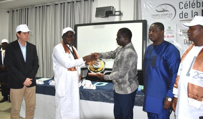 La cérémonie a également été marquée par la remise d’un cadeau notamment un trophée de la FNGPC au gouverneur des Plateaux destiné au président du conseil Faure Gnassingbé, des distinctions honorifiques ont été décernées aux acteurs et sponsors ayant contribué de manière significative au développement de la filière coton.
